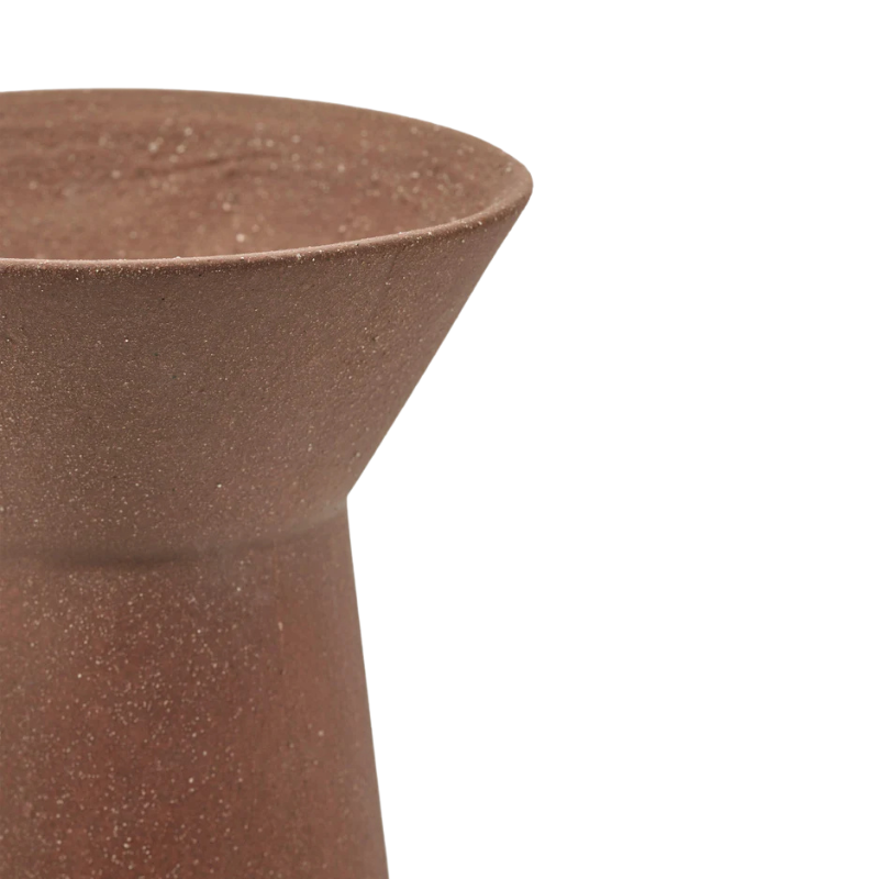 Crafted from red clay enriched with extra chamotte, the vase has a distinctive matte texture and natural tactile finish. The exterior remains unglazed to highlight the beauty of the raw material, while the interior is treated for waterproof functionality, allowing the vase to hold fresh flowers as well as dried arrangements.
